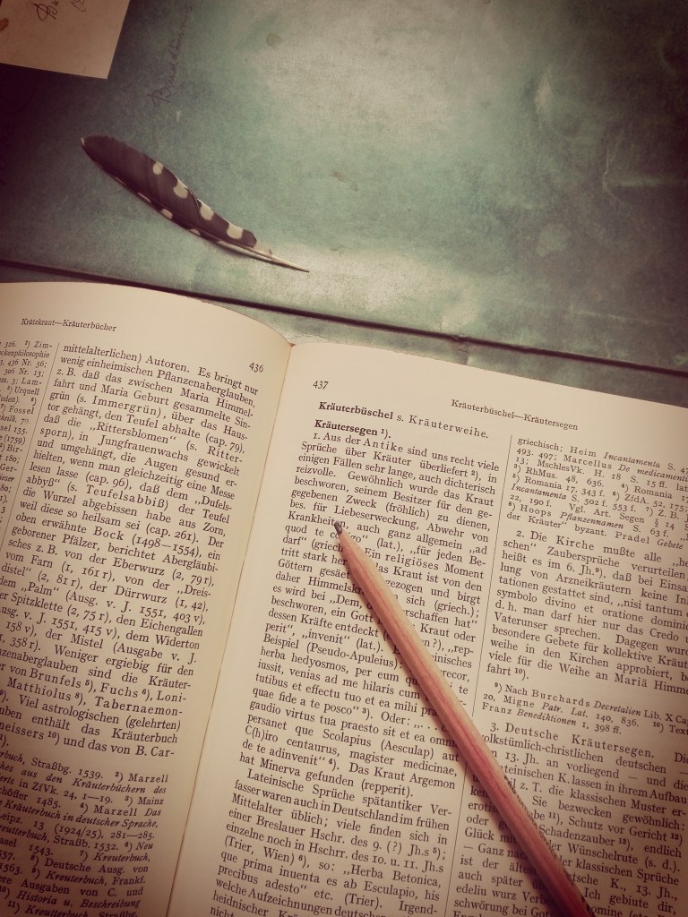 Nachlesen: Handwörterbuch des deutschen Aberglaubens (1927 ff.), Hg. Hanns Bächtold-Stäubli, Berlin und Leipzig; Vorwort (Bd. I); „Kräutersegen“ und „Kräuterweihe“ (Bd. V, Sp. 437-446); „Frauendreißiger“ (Bd. II, Sp. 1775); „Hexe“ (Bd. III, Sp. 1869f.).