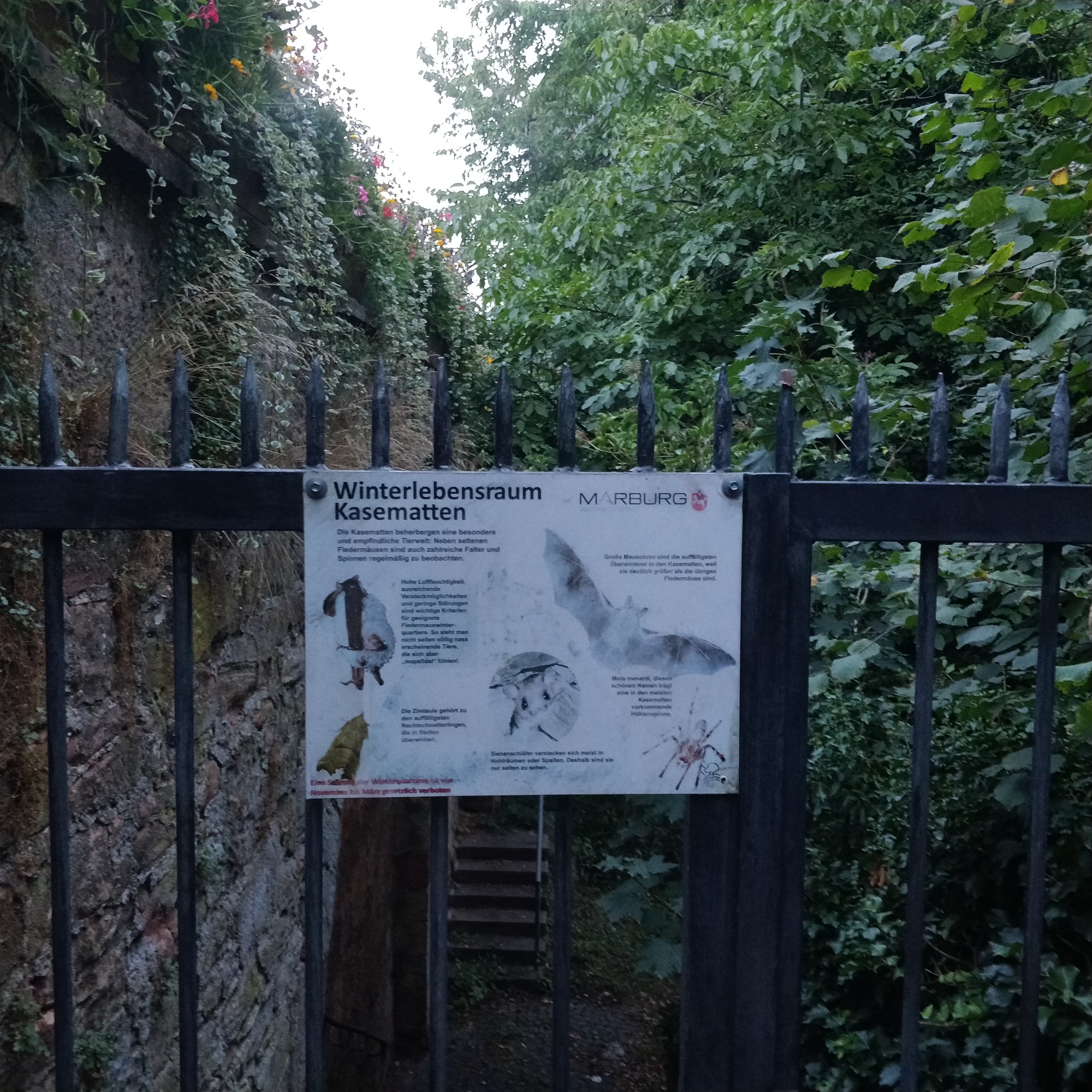 In den Kellern unter dem Marburger Schloss verbergen sie sich: Tausende Fledermäuse finden hier jährlich ihr Winterquartier. Damit sind die Kasematten und Keller heute das größte bekannte Winterquartier in Deutschland. Dort ruhen die Fledermäuse ab Oktober im Winterschlaf bis zum Frühling. Verschiedene Arten sind in den Marburger Kasematten, nahe der Waggonhalle, unter dem sog. Hexenturm oder dem Gelände der ehemaligen Brauerei zuhause. Weit verbreitet sind die Zwergfledermäuse deren Körper bei einer Flügelspannweise von ca. 20 cm gerade mal 3 bis 5 cm klein und 4,5 bis 7 Gramm leicht ist. Die verschiedenen Fledermausarten wiegen drei bis vierzig Gramm und können bis zu 30 Jahre alt werden. Keine der in Deutschland einheimischen Arten trinkt Blut, sie fressen hingegen viele Insekten und Stechmücken. Mit den menschengroßen Dämonen vom Hexen*sabbat oder den feuerspeienden Drachen aus den niederländischen Ölgemälden, haben diese kleinen, fliegenden Säugetiere nicht viel gemein.