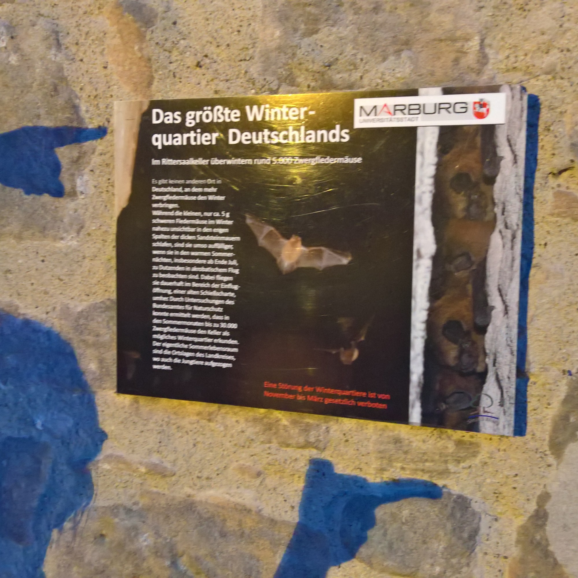 Marburg ist die Stadt der Student*innen, der Universität, des Fachwerks, im Jahr 2020 auch der Reflexion über die Verfolgung von Hexerei, des Landgrafenschlosses und der Fledermäuse! Da sie im Winter unter dem Schloss ruhen, sind sie gerngesehene Nachbar*innen. Insbesondere die Zwergfledermäuse leben gerne mit im Siedlungsgebiet und in der Stadt, wo sie sich in kleinen Zwischenräumen an Gebäuden zurückziehen. Sie können am Schloss auch angeschaut und angehört werden. Die Echorufe der Fledermäuse sind eigentlich nicht für menschliche Ohren wahrnehmbar. Mit dem Fledermausdetektor am Marburger Schloss können die Ultraschallwellen jedoch umgewandelt und angehört werden. Dabei können auch im Umkreis aufgenommene Rufe live hörbar werden. Die Fledermäuse dürfen in Ruhe in den Schlosskellern ihren Winterschlaf halten. Der NABU zeichnete das Landgrafenschloss im Jahr 2008 daher als fledermausfreundliches Haus aus.
