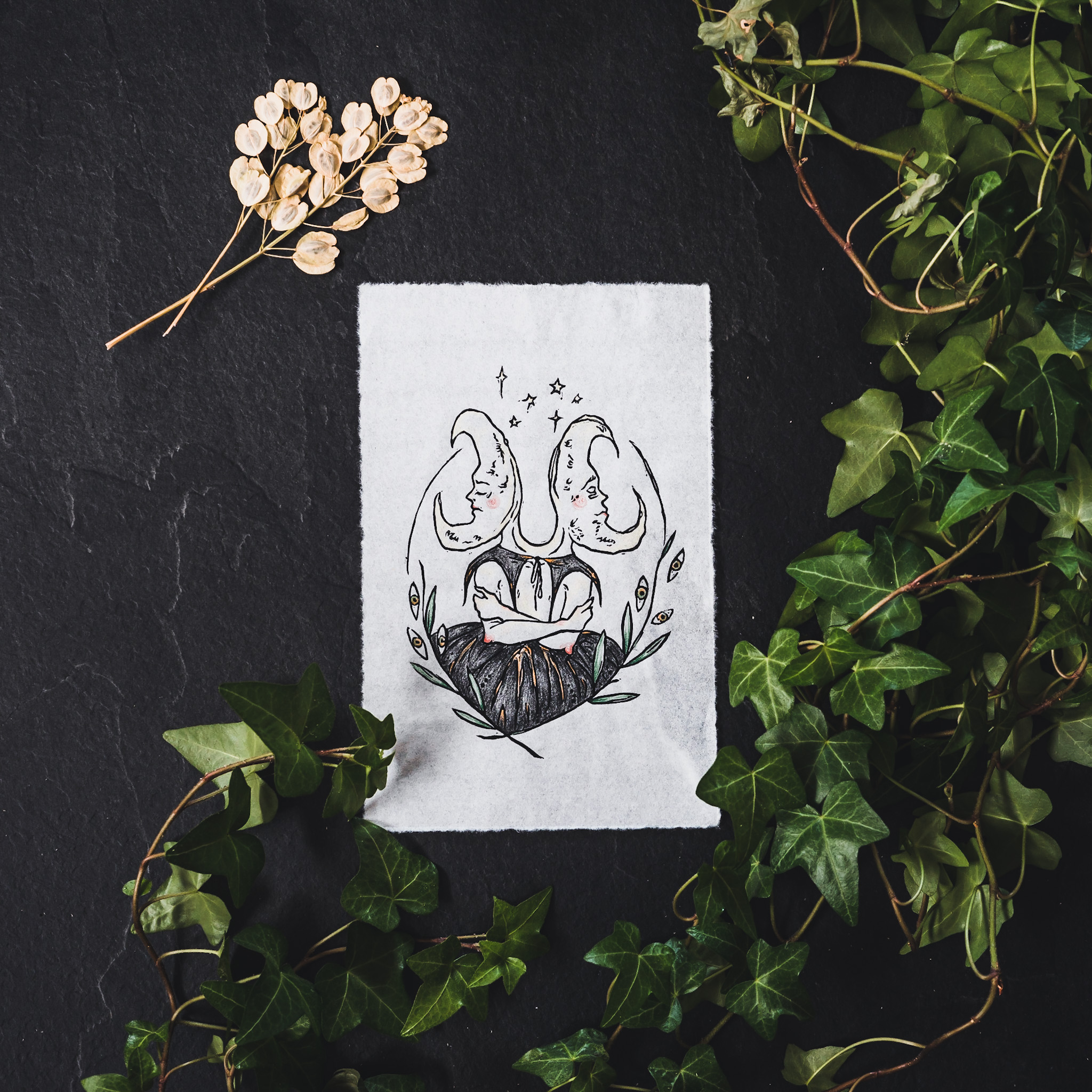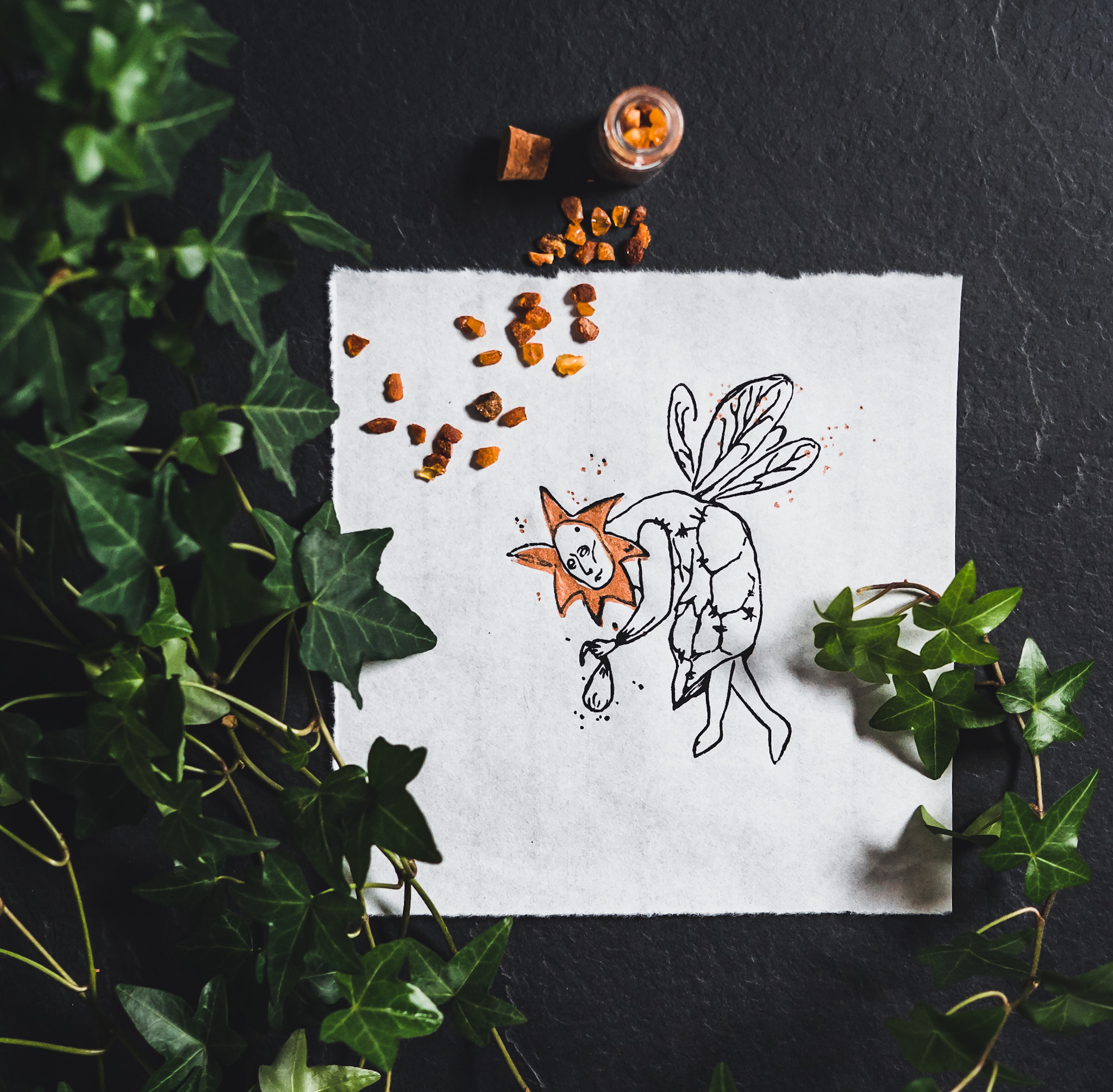 JS: „Zu Beginn des Hexenjahres habe ich mir überlegt, mich mehr mit Kräutern auseinanderzusetzen. Ich habe viele Pilze gezeichnet, sie warten im Skizzenbuch auf ihre weitere Umsetzung. Meine Arbeiten kreisen nicht mit Absicht um das Thema Magie und Spiritualität. Das kommt einfach aus dem Arbeiten raus, weil ich mich selbst gerne mit Energie beschäftige.“