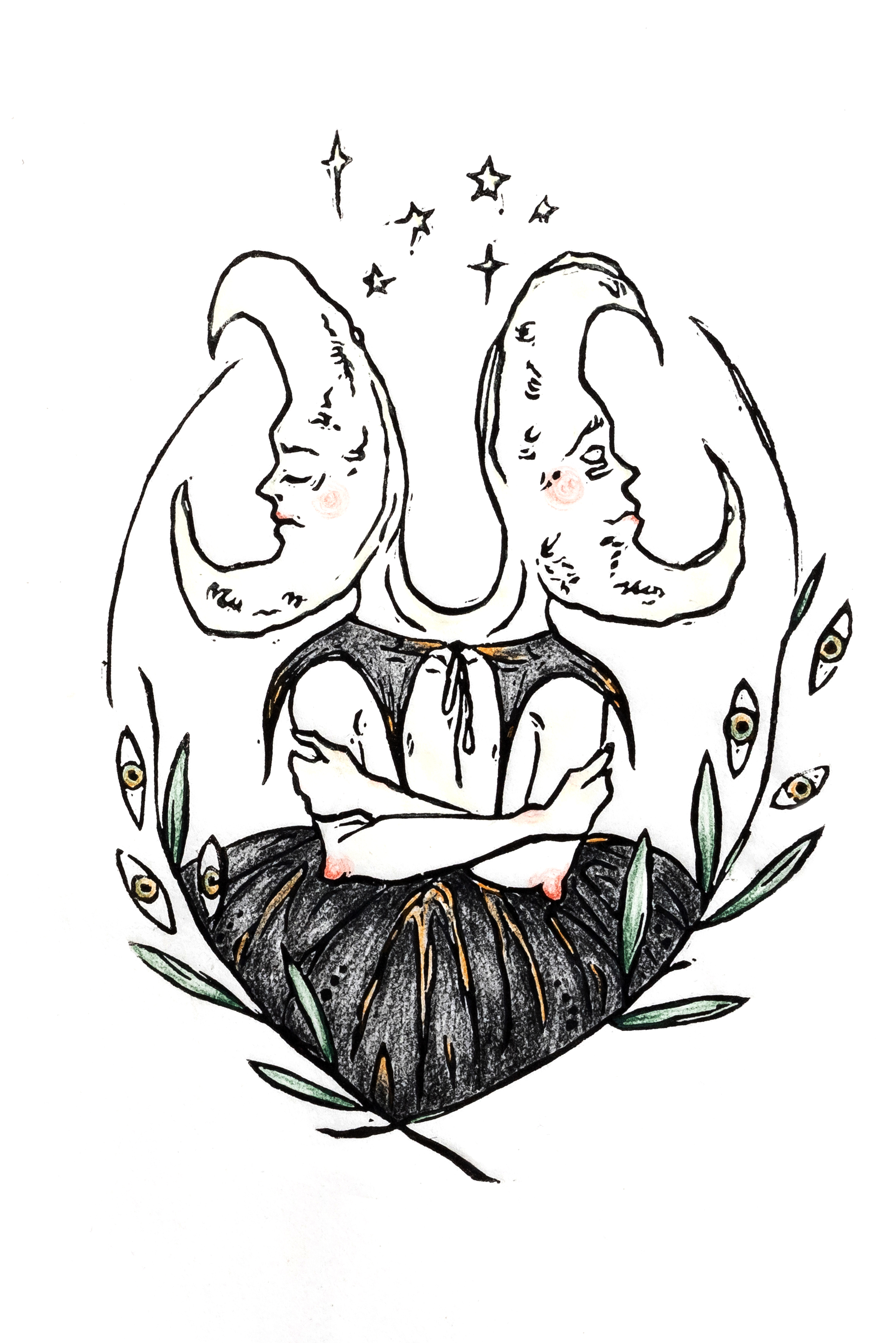 JS: „Ich habe eine Sternzeichenserie begonnen. Es gibt den Wassermann als Ausgangspunkt, da ich selbst Wassermann bin. Dabei bin ich zwiegespalten, was die Sternzeichen angeht – wenn das Radio mir morgens sagt, wie mein Tag wird. Gleichzeitig kann viel aus der genauen Sternenkonstellation zum Geburtszeitpunkt herausgelesen werden. Ich frage mich immer: Kann man daran glauben oder nicht?“ Joan und ich teilen unsere Zuordnung zum Sternzeichen des Wassermanns und ein ambivalent-fasziniertes Verhältnis zur Deutung der Gestirne. Ob nun von der Konstellation zu Geburtszeit und -ort oder durch die Auseinandersetzung mit morgendlichen Radiohoroskopen beeinflusst – im Gespräch stellten wir beide fest, dass Zuschreibungen ganz unwillkürlich auf und durch uns stattfinden. Wir greifen diese in unserem Selbst- und Weltbild auf oder grenzen uns bewusst davon ab.