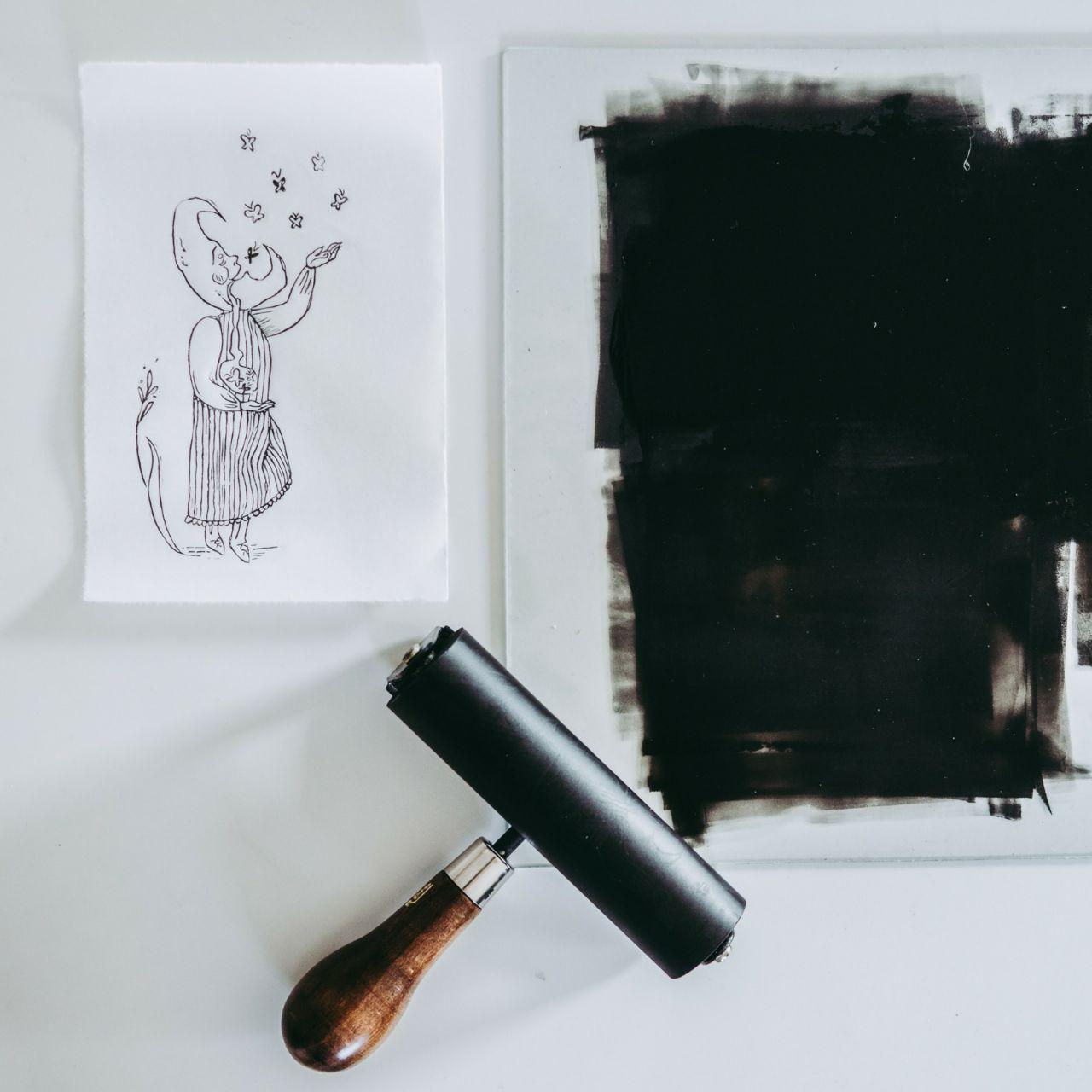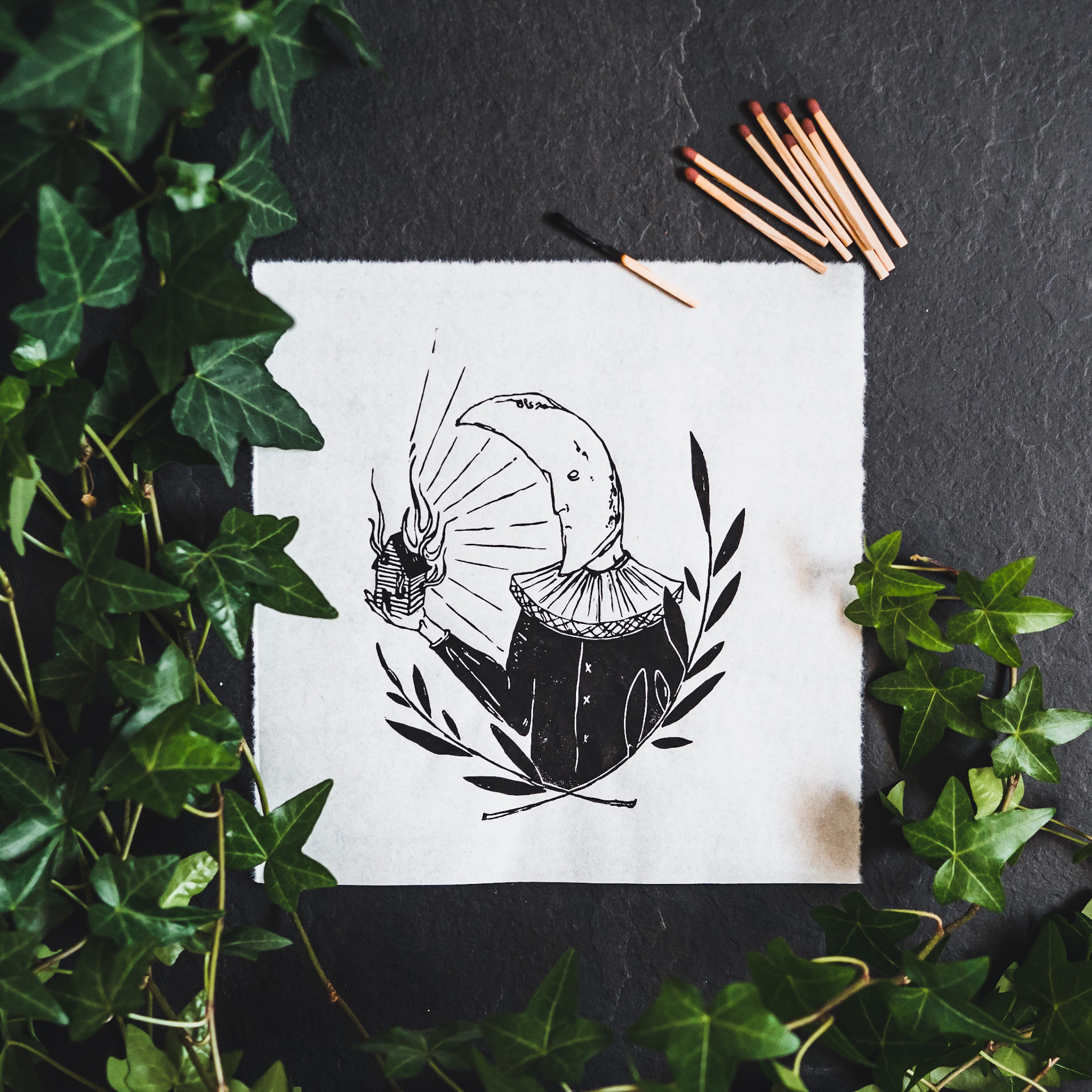 JS: „Ich habe das Gefühl, dass ich in manchen meiner Arbeiten – das sind dann auch die, die mir besonders am Herzen liegen – einen energetischen Knotenpunkt sammle. Das ist so bei der Alchemiearbeit der Moonfaces. Wenn ich sie ansehe, gibt sie mir ein Gefühl: Sie verortet mich in einem nachdenklich-entspannten Sein. Ich bin ein hibbeliges Arbeitstier – mache alles gleichzeitig. Dann suche ich mir Punkte mit denen ich runterkomme. Manchmal habe ich das Gefühl, meine Unruhe an die Arbeit abzugeben, hinein in den Linolschnitt. In der Arbeit wandle ich das um. Aus dem Gefühl kann ich Kreatives schaffen – da bündelt sich in den Arbeiten viel Gefühl.“