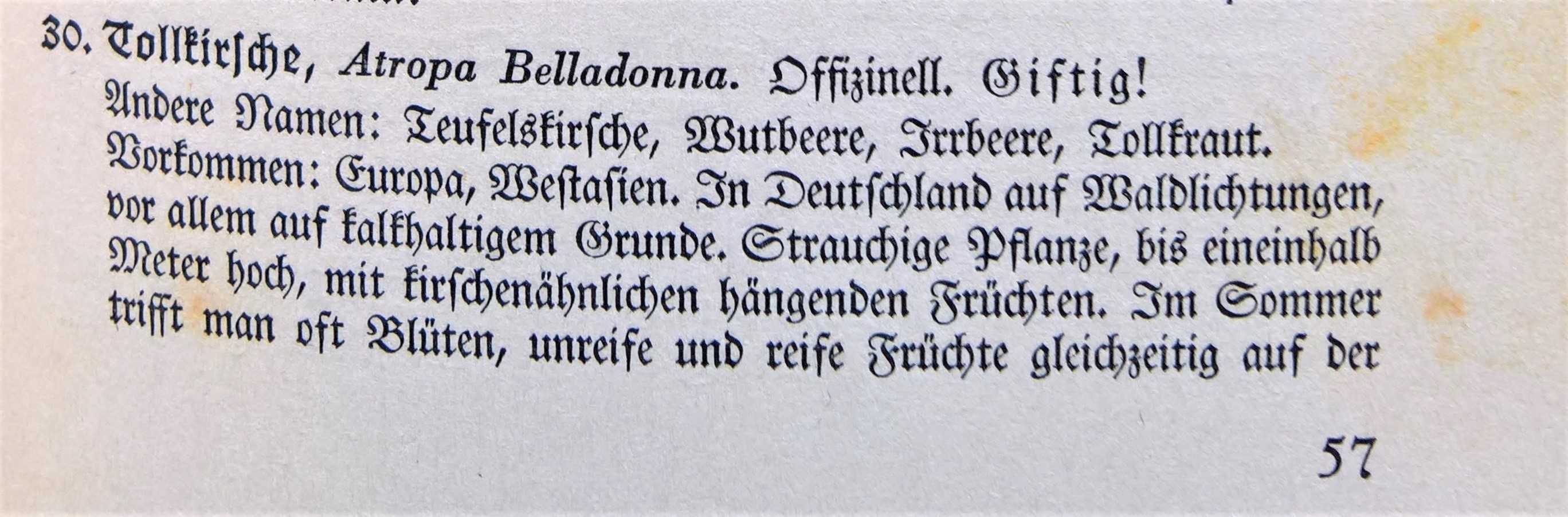 Die schwarze Tollkirsche (Atropa belladonna L.) wird in diesem Buch auch Teufelskirsche genannt. Die Pflanze wird damit zwar buchstäblich verteufelt, ihre Wirkung jedoch gleichzeitig anerkannt: Sie soll hier gegen „Augenleiden“ helfen. Tatsächlich wurde sie seit dem Mittelalter in die Pupillen geträufelt, damit sich diese weiten und die Praktizierenden damit angeblich attraktiver wirkten. Wie Pflanzen selbst Geschichte schreiben? Vielleicht tun sie dies mit ihrem halluzinogenen Einfluss auf Menschen, wenn ihre Nutzung Teil der Kultur und des Alltags wird. Der Konsum von Teilen des Nachtschattengewächses führt zu starken Sinnestäuschungen oder zum Tod. Die Tollkirsche wurde zur Giftpflanze des Jahres 2020 ernannt. So wird es in der Kampagne „Magie der Kräuter“ in Marburg beschrieben.