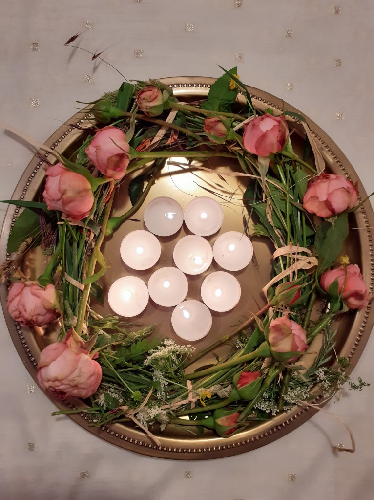 Rosen und weitere sommerliche Blumen liegen auf dem Altar. Dies kann z.B. in Form eines Kranzes sein, und alle die feiern, können sich ebenfalls mit Blumen schmücken.